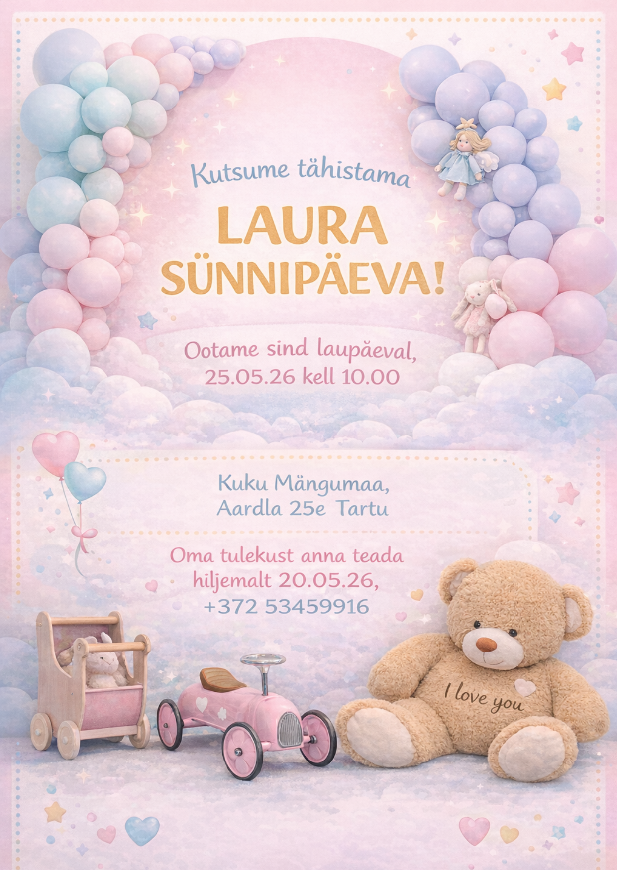 Q: Kas teie juurde saab ka käruga tulla? A: Jah, käruga peaks küll teisele korrusele üles saama, seega on vaja veidi abi, kuid mängumaal on mõnus väike terrass, kuhu võib käru jätta ja seal saavad pisikesed isegi oma päevaund magada, kui peaks uni peale tulema, kuna mängumaalt on terrassile klaasist sissepääs ja vaade.